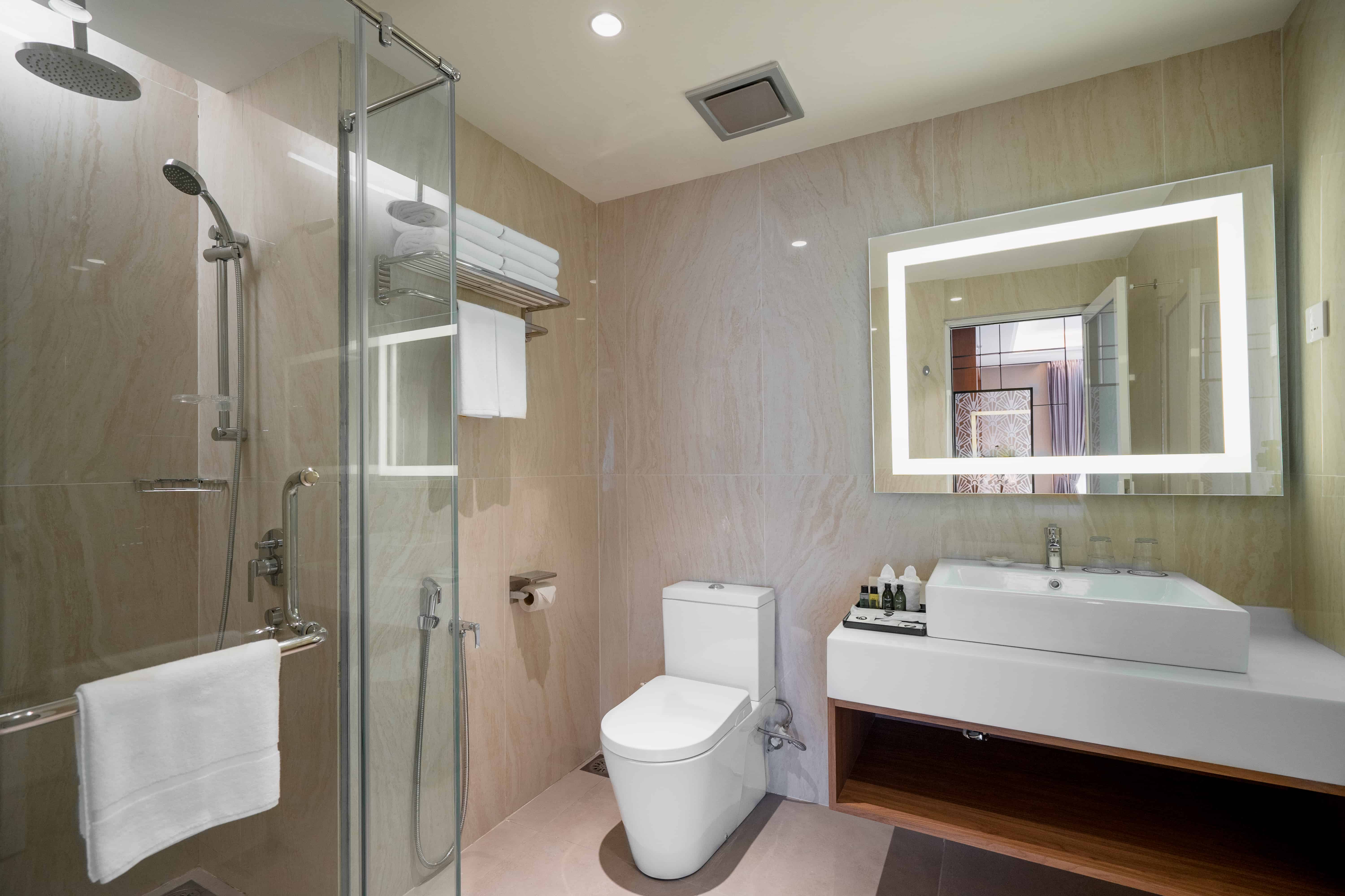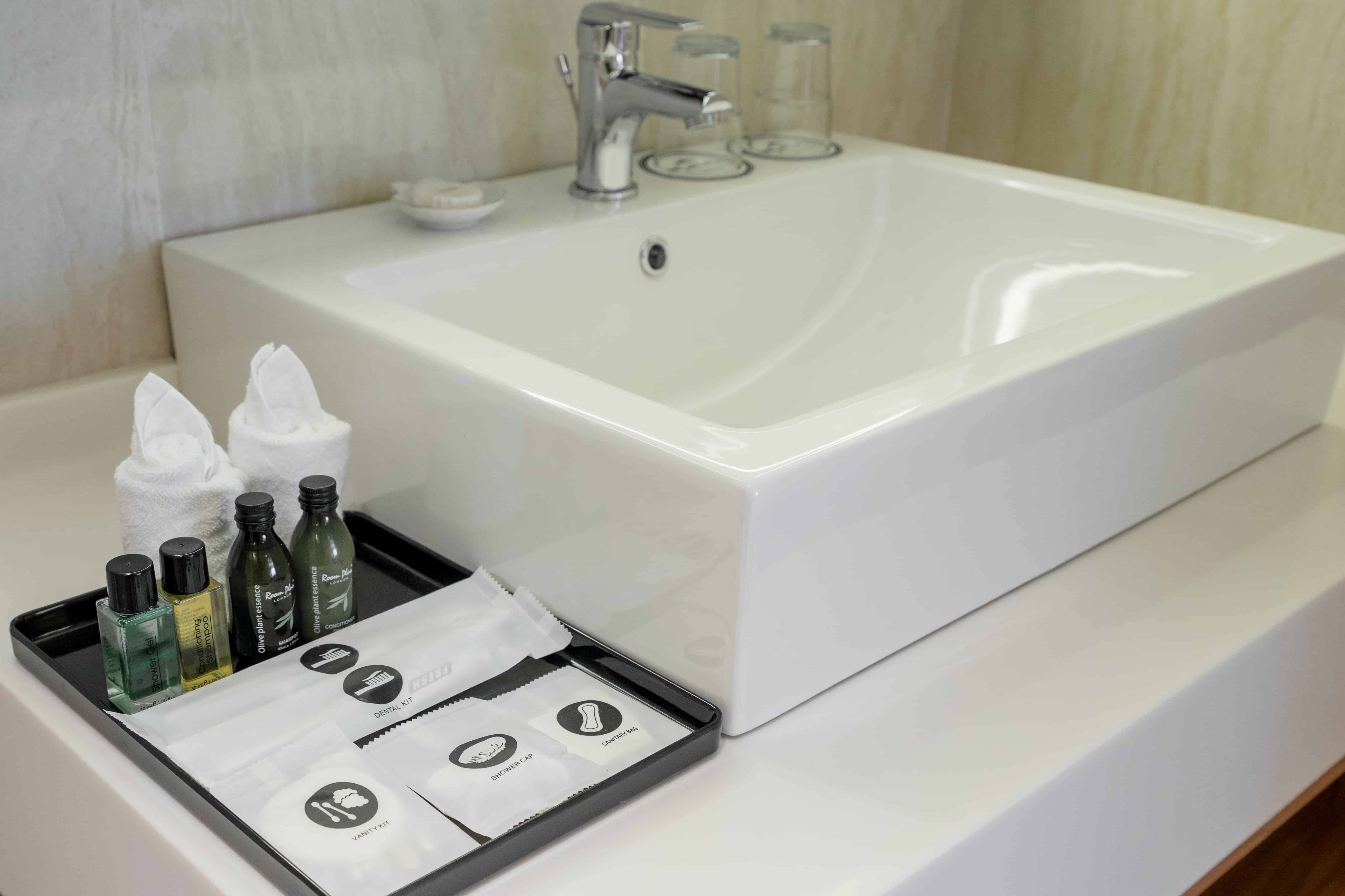 The Junior Suite boasts a cosy atmosphere equipped with a king-sized bed and 50-inch flat screen television.  Bathrooms are equipped with standard amenities such as shower gel, shampoo, conditioner, toothbrush and vanity kits.